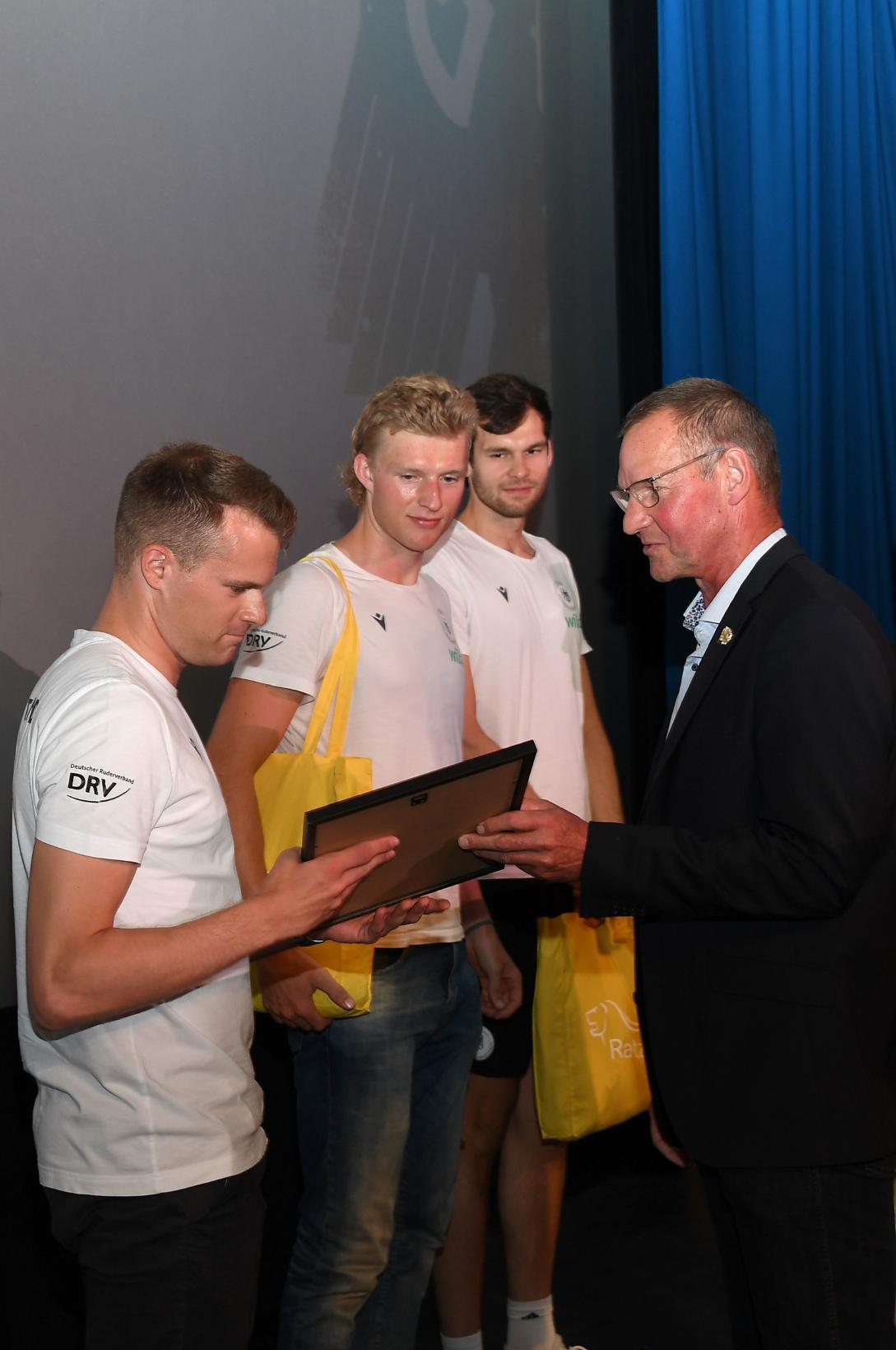 Anschließend konnten es sich alle Anwesenden in den roten Kinosesseln bei Popcorn und Softdrinks bequem machen. Gezeigt wurde ein Ruder-Streifen: „Boys in the Boat“, der aktuelle Spielfilm des bekannten Schauspielers, hier aber als Regisseur tätigen George Clooney. Erzählt wird darin die Geschichte des US-Achters, der 1936 bei den Olympischen Spielen in Berlin überraschend die Goldmedaille holte. Über sich hinauszuwachsen, das haben auch die deutschen Ruder:innen in Paris vor.