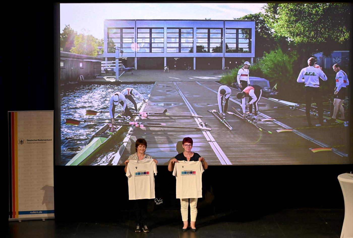 Der modernisierte und ausgebaute Bundesstützpunkt Ruderakademie hat nun auch ein eigenes Logo, ebenfalls von der Designerin Zuzana Bahulova entworfen, das Ruderakademieleiter Reinhart Grahn vorstellte. Es greift mit zwei Mal fünf Rechtecken die ursprüngliche Fensteransicht der Akademie auf. Tabea Schendekehl aus dem Frauen-Doppelvierer formulierte den Dank der Athleten an die Ruderakademie und deren Angestellte für die sehr guten Trainingsbedingungen. Helma Burazerovic, Ratzeburgs 2. Stellvertretende Stadtpräsidentin, richtete ein Grußwort an die Nationalmannschaft, in dem die jahrzehntelange enge Verbundenheit zwischen Stadt und Rudern zum Ausdruck kam, die sich auch in der Beteiligung an den noch nicht abgeschlossenen Baumaßnahmen niederschlug. „Sie können sicher sein, dass wir in Ratzeburg mitfiebern werden, wenn Sie um Medaillen kämpfen“, sagte Burazerovic.