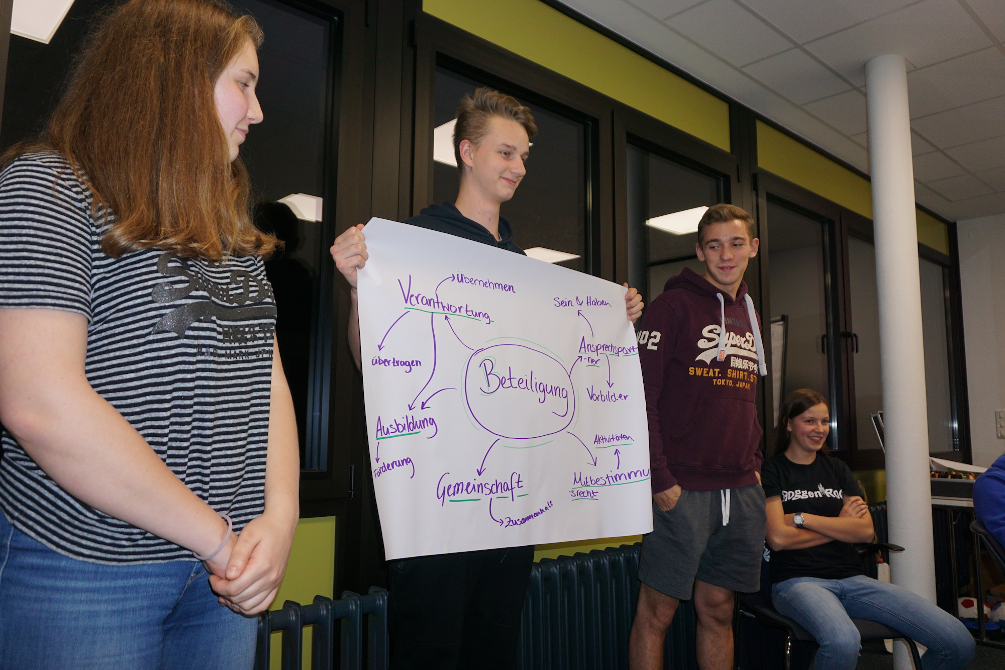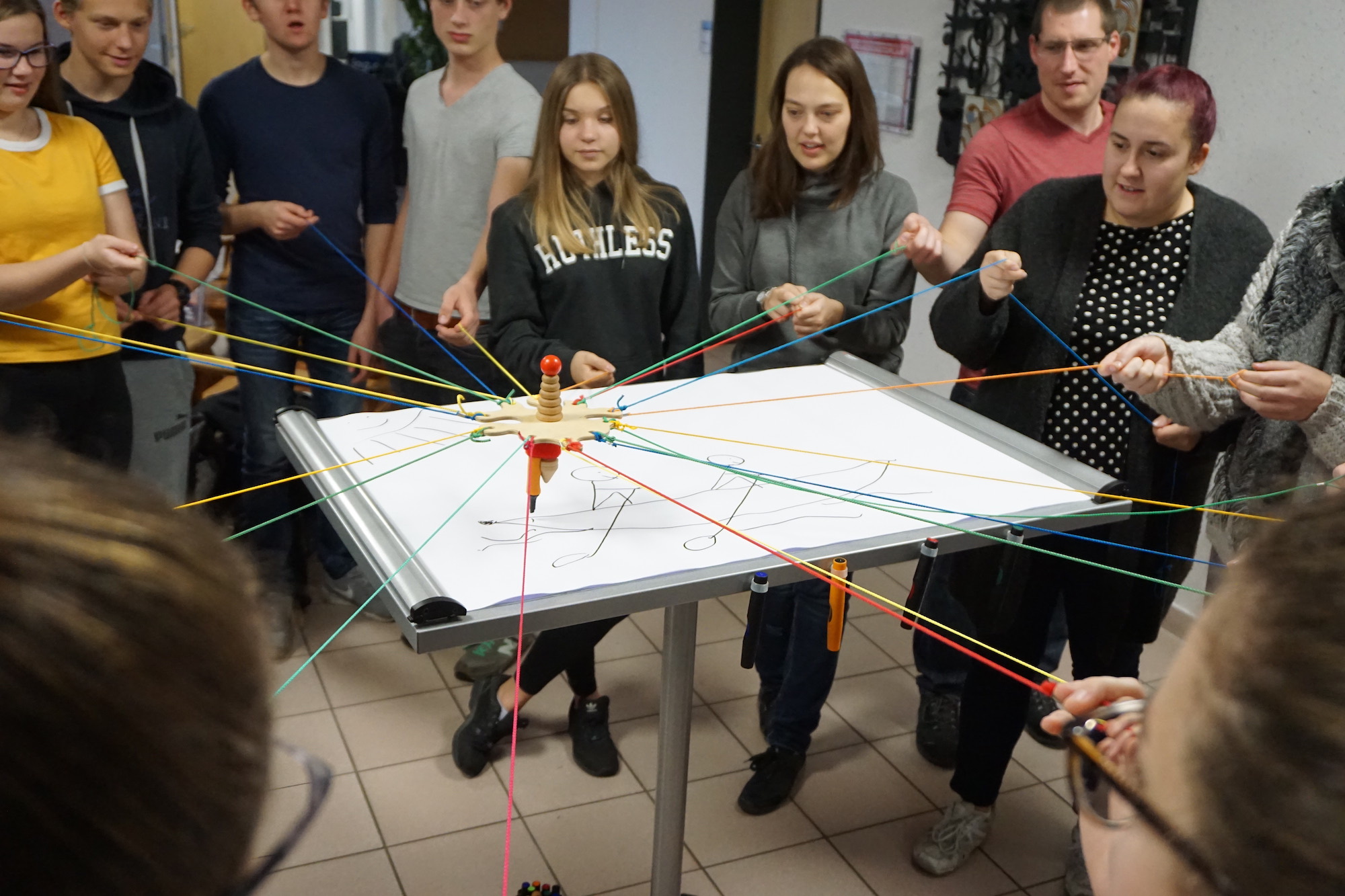 Hatte ich schon erwähnt, dass an diesem Wochenende für uns keine Langeweile aufkam? Nur für die notwenigsten Informationen gab es kleine Vorträge, die meisten Inhalte erarbeiteten wir uns in Gruppen, durch Aufgaben und viel Interaktion selbst. Das schöne war: Alles ohne Druck, nicht wie in der Schule. So lag die Gestaltung des Samstages fast allein in unserer Hand. Am Tag zuvor hatten wir uns in Eventgruppen aufgeteilt und die Aufgabe bekommen vier Inhalte des nächsten Tages zu gestalten. Die erste Aufgabe einer Eventgruppe war die „Morgenzeitung“. Dabei sollte die Gruppe die Ereignisse der letzten Tage auf kreative Weise zusammenfassen. Sie haben sich für eine Wiederholung in Form eines Spiels entschieden, bei dem wir Wörter erraten mussten, die etwas mit den Inhalten des gestrigen Tages zu tun hatten.