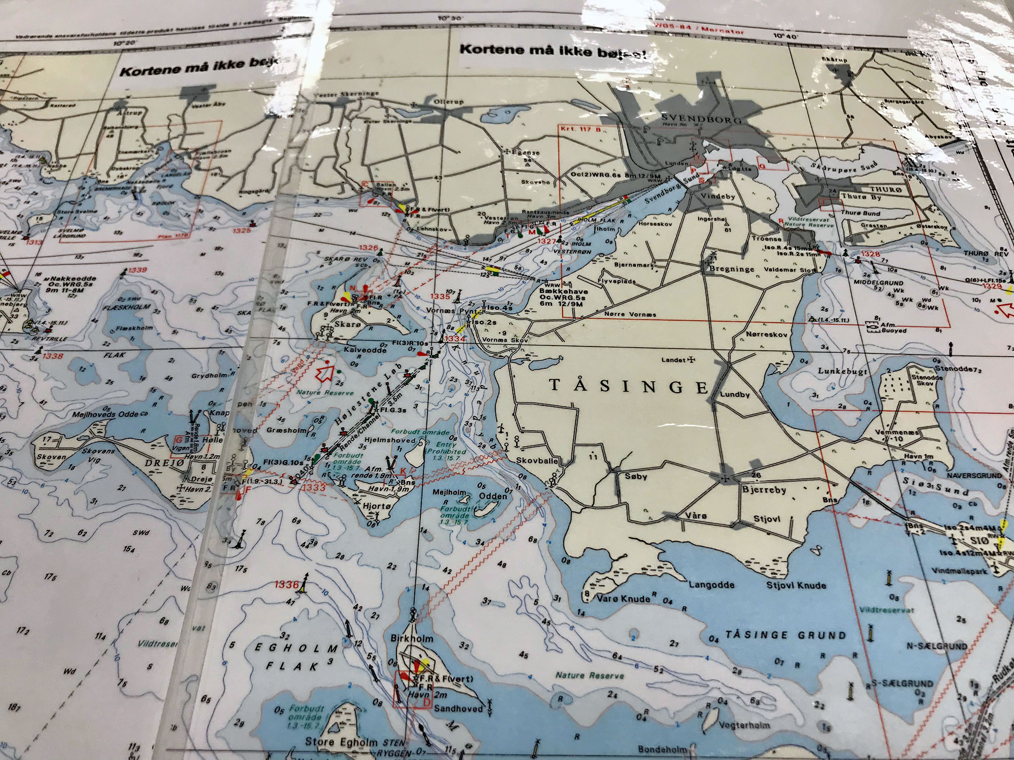 Weiter ging es dann mit Seezeichen und dem richtigen Lesen der Seekarten. Wo stehen welche Fahrwassertonnen? Wo sind Gefahrentonnen, die umschifft werden müssen? Als dann Niels und Lise große, laminierte Seekarten auspacken, wurde es ernst: In kleinen Gruppen sollten die Teilnehmer jetzt Wanderfahrten in der Dänischen Südsee planen und diese dann mehr oder weniger lustvoll dem Kreis vortragen.