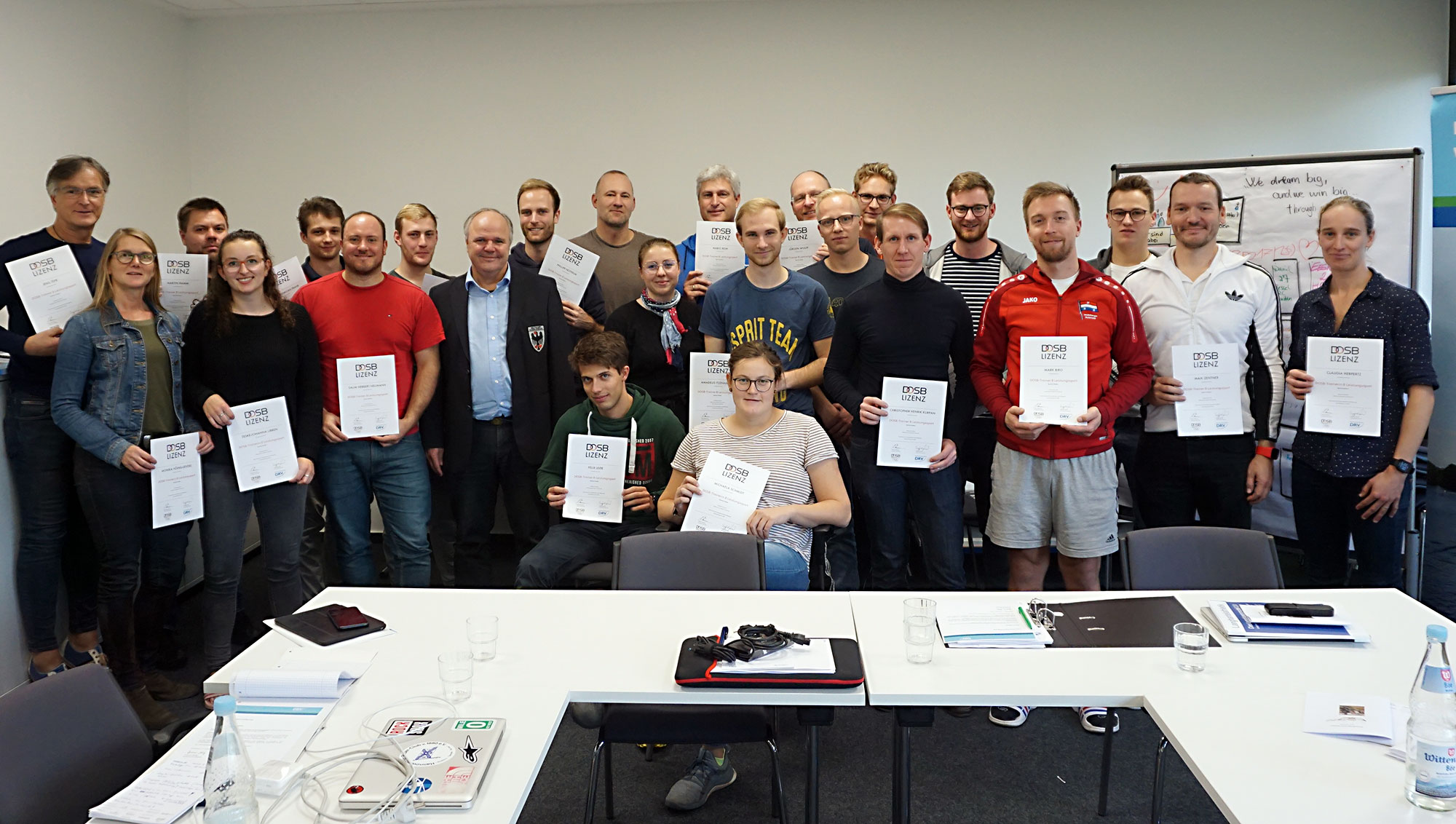 … als endlich fast alle Teilnehmer/-innen am 17. November 2019 ihre DOSB Trainer B Urkunde aus den Händen des DRV-Präsidumsmitglied Reinhart Grahn freudig entgegennehmen konnten, lag ein letzter abwechslungsreicher Ausbildungstag hinter uns. In knapp drei Stunden ließen wir Prüflinge sämtliche Ausbildungsthemen nochmals im Schnelldurchlauf Revue passieren. Vom „Boote trimmen und Material“ mit Jost Schömann-Finck, „Trainingsplanung“ mit Stephan Froelke, „Langhanteltraining“ mit Martin Zawieja, „Sportmedizin“ mit Dr. Michael Stüfe, „Rudertechnik“ mit Thorsten Kortmann, „Sportpsychologie“ mit Dr. Gaby Bußmann und Sophie Petzold, „Stabilisationstraining“ mit Hauke Meyer-Koop bis „Ernährung“ mit Hagen Heidinger stellten wir das im Namen des DRV von Andreas König komponierte Menüarrangement zweier Präsenzphasen variantenreich dar. Power-Point-Präsentationen wechselten in 15-minütiger Taktung mit Rollenspielen, Produktpräsentationen und szenischen Darstellungen.