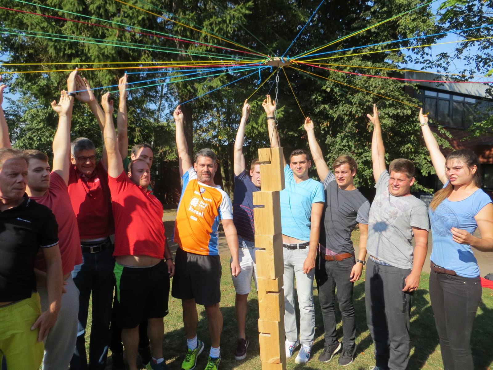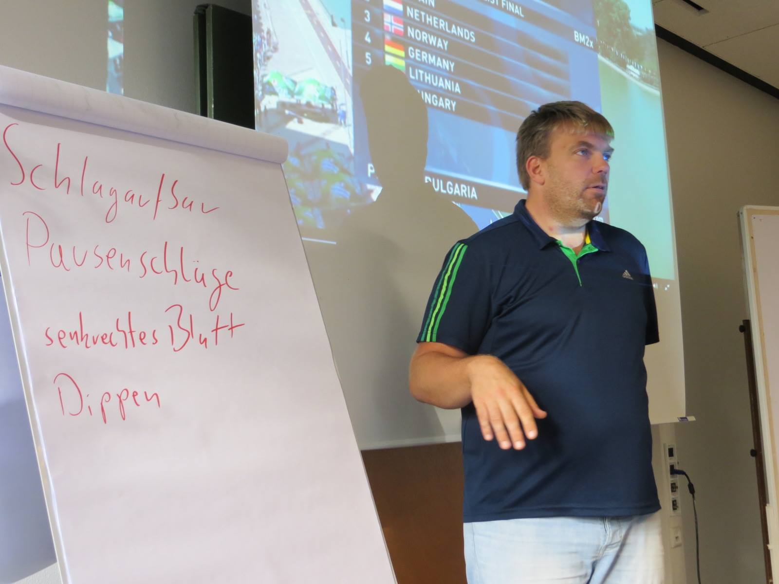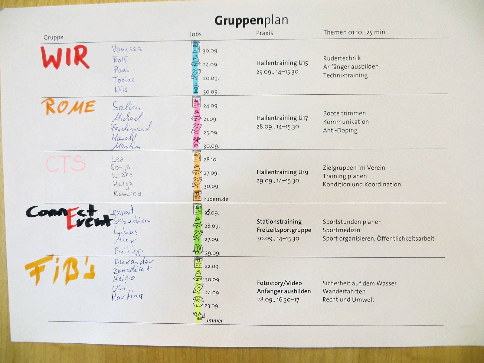 Unter den 25 Gesichtern die man in dem Seminarraum der Ruderakademie sah, war auch der oben bereits erwähnte, Andreas zu finden. Sein Namensschild von beiden Seiten zu beschriften hätte allerdings nur was gebracht, wenn er selbst seinen Namen manchmal vergessen würde, denn er ist wie in den Vorjahren der Leiter dieses Lehrgangs gewesen, und hinter ihm war nur noch die Wand. Nach den Spielchen sorgte er dafür, dass sich zügig 5 gleichgroße Gruppen bildeten, und brachte uns schonend die Gruppenaufgaben nahe, deren Bearbeitung aus Reflex erst einmal möglichst weit nach hinten verschoben wurde. Na ja fast, denn das Ausdenken eines Team-Namens, war zwar keine leichte, dafür aber unfassbar wichtige Aufgabe, die sofort auf kreative Weise in Angriff genommen werden musste.