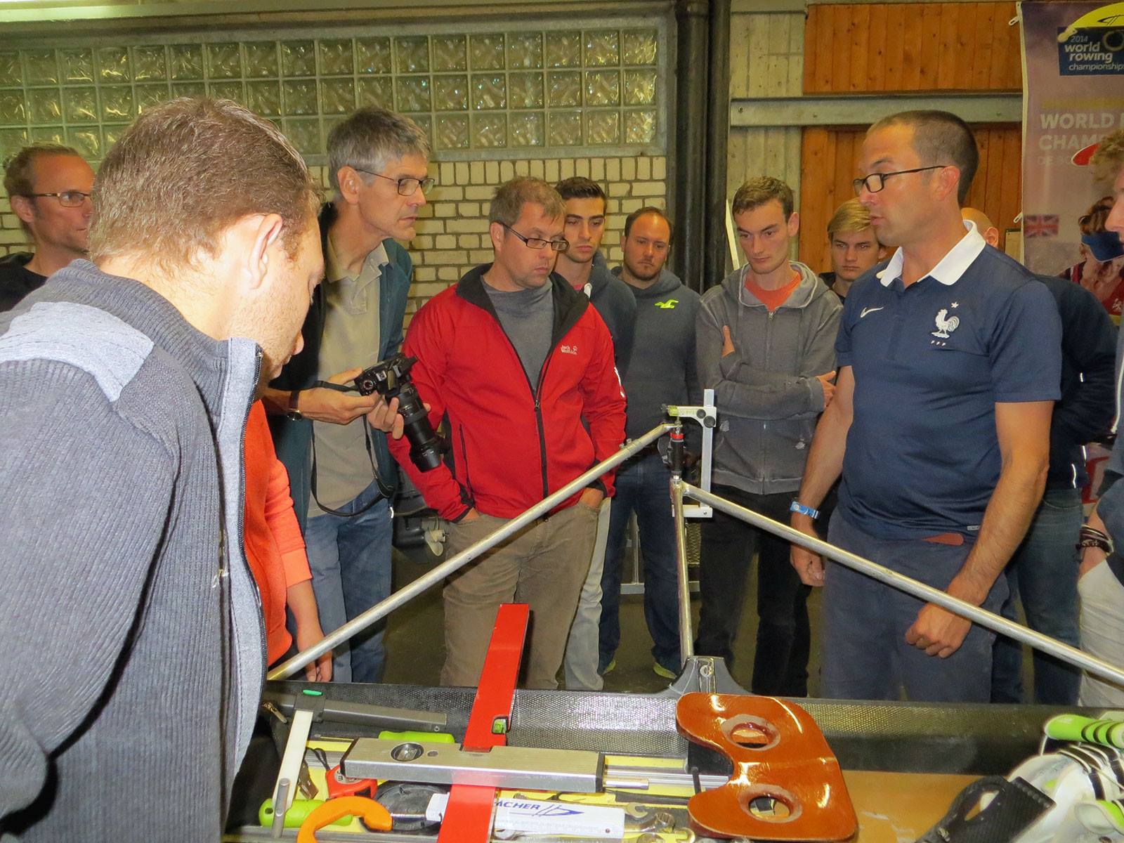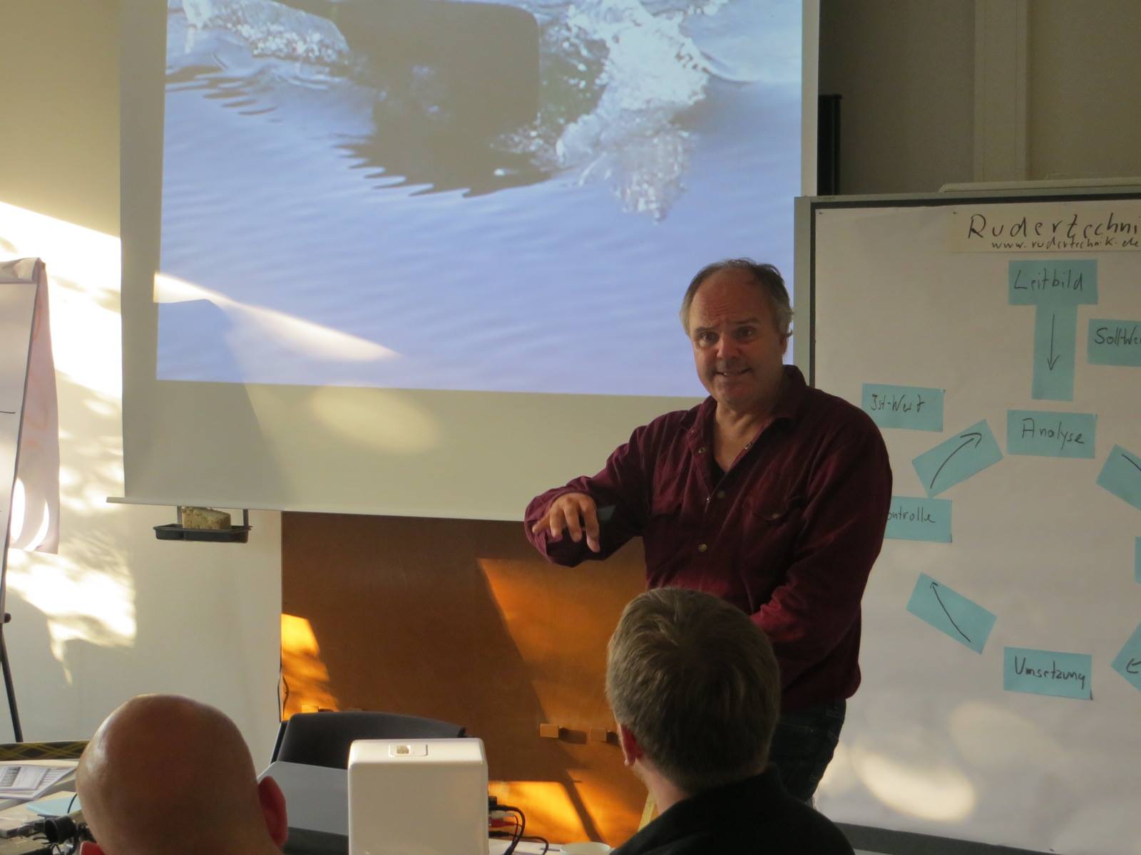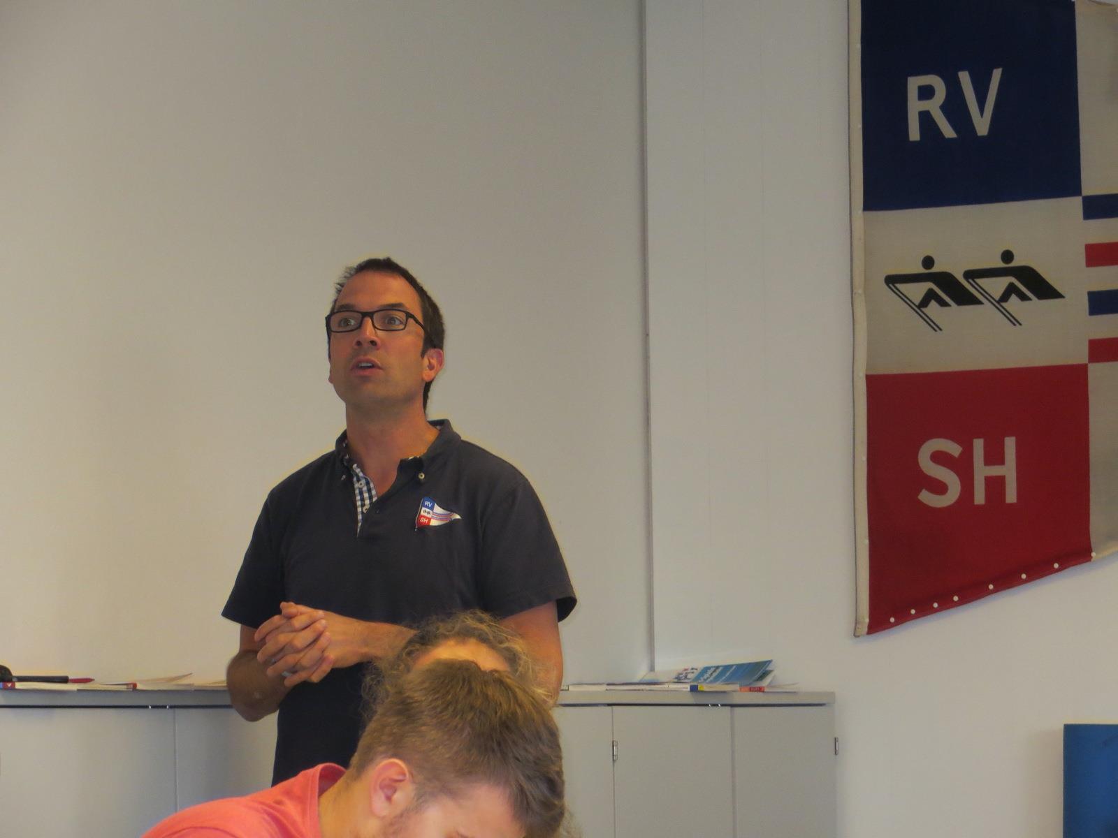 Nach diesem kleinen Exkurs kehrten wir schnell, wenn auch etwas wehmütig, zu den ruderspezifischen Inhalten zurück. Hierbei wurden nicht nur die Bewegungsabläufe anhand des offiziellen Leitbildes besprochen (mit Reinhart Grahn), sondern auch Methoden und Organisationsformen im (Anfänger-)Training, sowie Wanderfahrten, Wettkampfregeln, Sicherheit auf dem Wasser, Zielgruppen im Verein, aber auch das Trimmen von Booten und vieles mehr thematisiert. Um uns die Wettkampfregeln nahe zu bringen moderierte Andreas ein Quiz, bei dem die Gruppen um jeden Punkt kämpften, und wer wollte, durfte sogar mit der „Wahrheit“ an einen Ausleger.