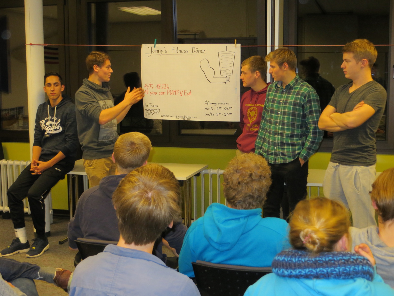 Am ersten Tag wurden wir zunächst in fünf Gruppen aufgeteilt. In diesen Gruppen mussten wir Unternehmen entwickeln, welche den Rudersport vereinfachen. So entstand der begehrte Fitness-Döner oder beispielsweise ein Unternehmen, welches Wanderfahrten an außergewöhnlichen Orten organisiert.