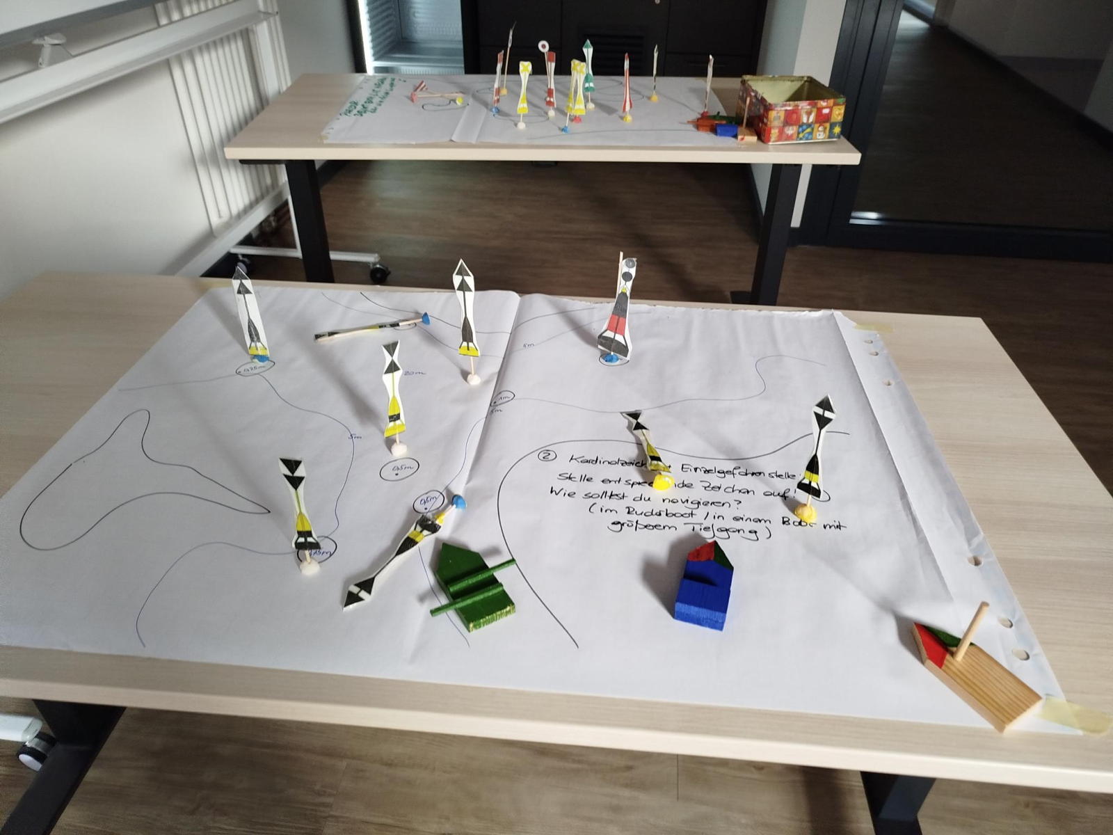 Über die Versicherungen hinaus haben die Langtursstyrmands-Anwärterinnen und Anwärter über die Dauer des Lehrganges ein straffes Programm absolviert, nämlich unter anderem: Materialkunde, Planung einer Wanderfahrt (Langtur) von der Strecke über die Versicherung, die Bootsausrüstung, die Wetterbedingungen, die Seesicherheit und die erste Hilfe bis hin zur ordnungsgemäßen Beendigung der Fahrt (oder der ungewollten Unterbrechung durch Schäden oder Ausfälle von Teilen der Besatzung). Der Umgang mit der Seekarte wurde erprobt, der Kompass eingesetzt, dieser auch im Freien bei Übungen zur Peilung. Der Lehrgang ließ weder notwendigen Stoff noch Wünsche offen – vielleicht doch einen: die praktischen Übungen an und in den beiden mitgebrachten Inrigger-Booten bei schönstem Wetter machten Lust auf eine Ausfahrt, die sich zeitlich aber leider nicht einschieben ließ, es soll aber im September einen praktischen Kursteil auf dem Wasser geben. Es gab sogar die praktische Übung, nach eigenem Gusto eine Wanderfahrt zu konzipieren und anschließen der ganzen Gruppe in einem fünfminütigen Vortrag vorzustellen – die durchaus kritische Rückfragen hatte. Womöglich wäre die eine oder andere Fahrt in der tatsächlichen Ausführung länger geworden, denn – merke! – Buchten, Sunde und Förden dürfen nur dann überquert werden, wenn der maximale Abstand zum Ufer 2,5 Kilometer nicht überschreitet. Das Spektrum der vorgestellten Fahrten ging von der Wochenendfahrt unter Freund(inn)en mit Übernachtung im Bootshaus bis zur Mehrtagesfahrt mit Hotelübernachtung. Der Lehrgang endete am Sonntag mit einer schriftlichen Prüfung und der anschließenden Besprechung der Ergebnisse.